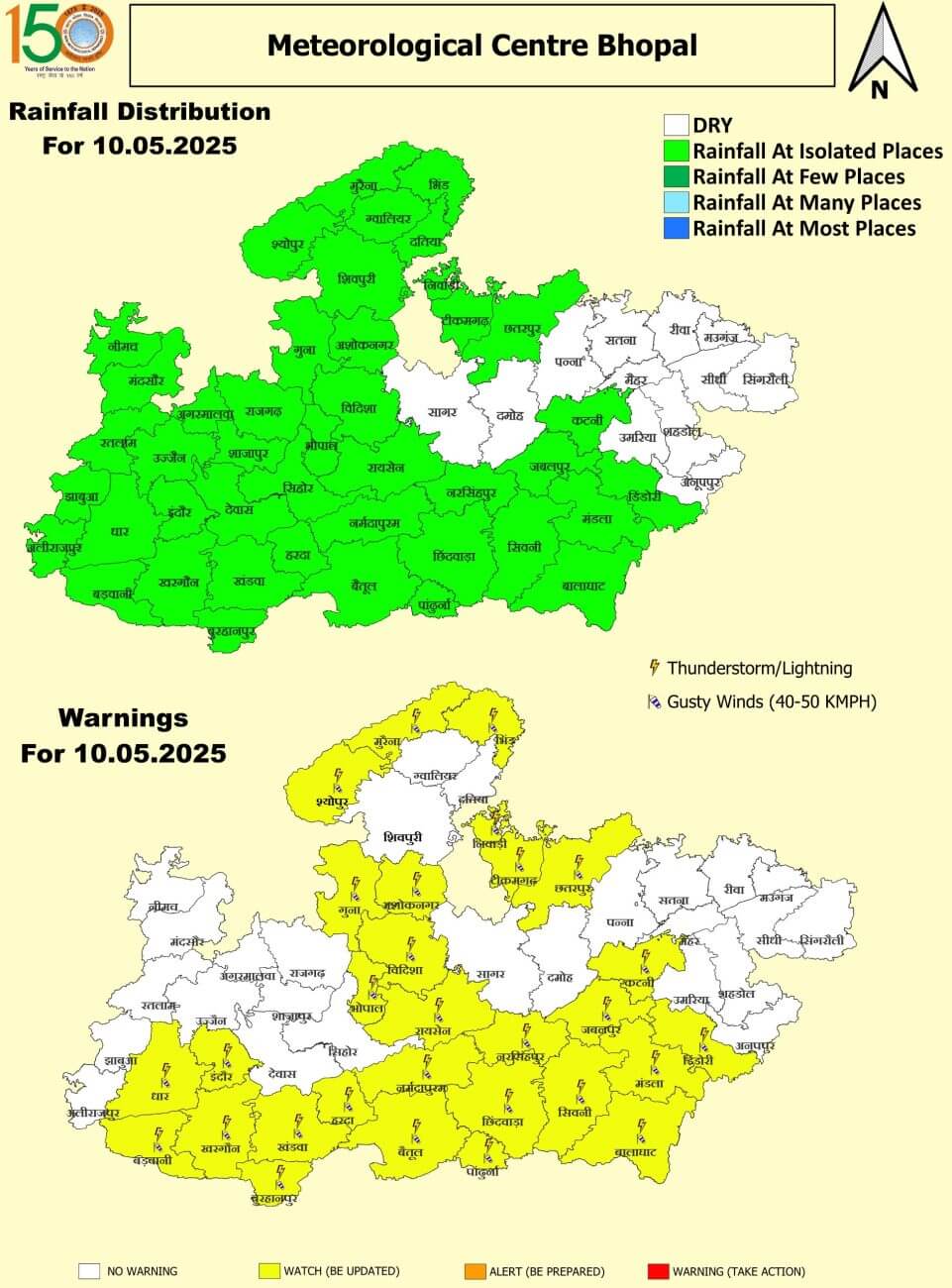 - 10 मई शनिवार : भोपाल, श्योपुर, मुरैना, भिंड, निवाड़ी, टीकमगढ़, छतरपुर, गुना, अशोकनगर, विदिशा, रायसेन, धार, बड़वानी, इंदौर, खरगोन, खंडवा, बुरहानपुर, हरदा, नर्मदापुरम, बैतूल, बरसिंहपुर, छिंदवाड़ा, पांढुर्णा, कटनी, जबलपुर, सिवनी, मंडल, डिंडौरी और बालाघाट में आंधी-बारिश ।
