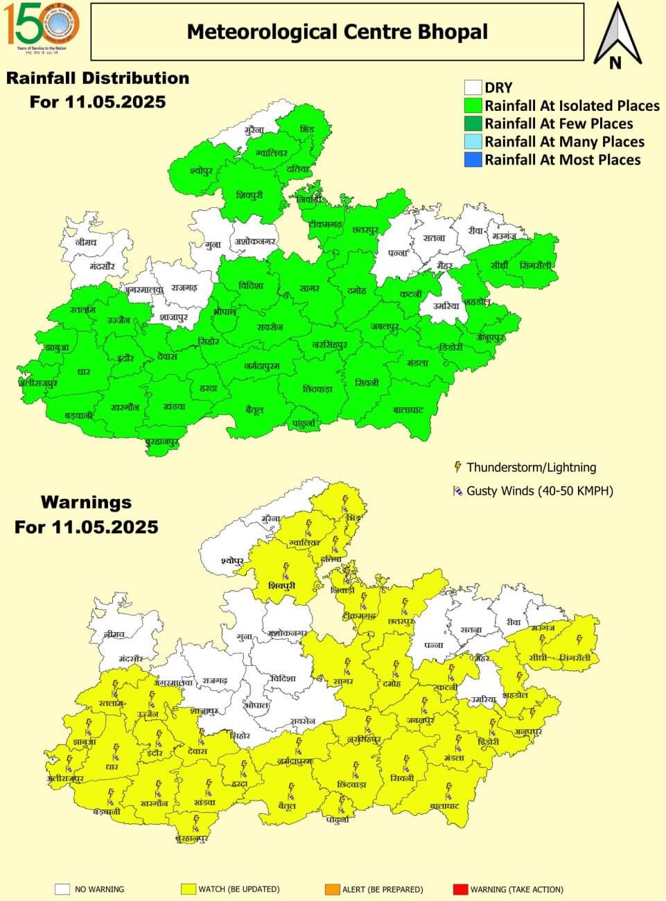 - 11 मई रविवार : इंदौर, उज्जैन, ग्वालियर, जबलपुर, भिंड, शिवपुरी, दतिया, निवाड़ी, टीकमगढ़, छतरपुर, सागर, दमोह, कटनी, सीधी, सिंगरौली, शहडोल, अनूपपुर, डिंडौरी, मंडला, बालाघाट, सिवनी, नरसिंहपुर, छिंदवाड़ा, पांढुर्णा, नर्मदापुरम, बैतूल, हरदा, देवास, खंडवा, बुरहानपुर, खरगोन, बड़वानी, धार, रतलाम, झाबुआ, अलीराजपुर में बारिश के साथ आंधी ।