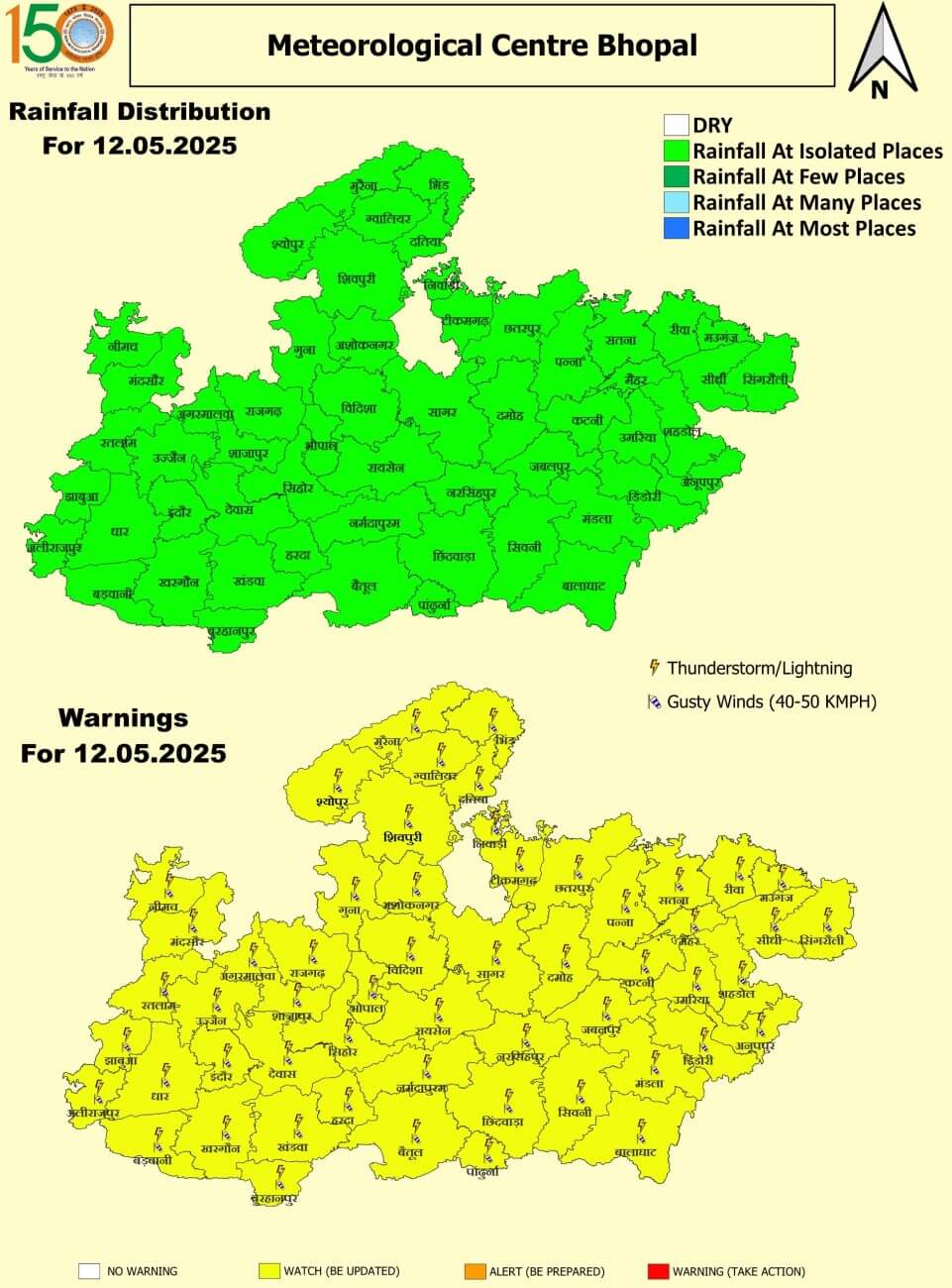 - 12 मई सोमवार : भोपाल, इंदौर, उज्जैन, नर्मदापुरम, ग्वालियर, चंबल, सागर, रीवा, शहडोल और जबलपुर संभागों में बारिश । 40 से 50 किमी प्रतिघंटा तक की रफ्तार से आंधी ।