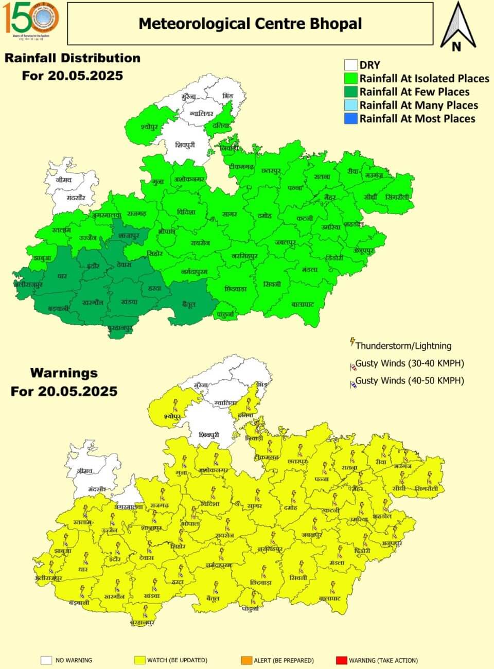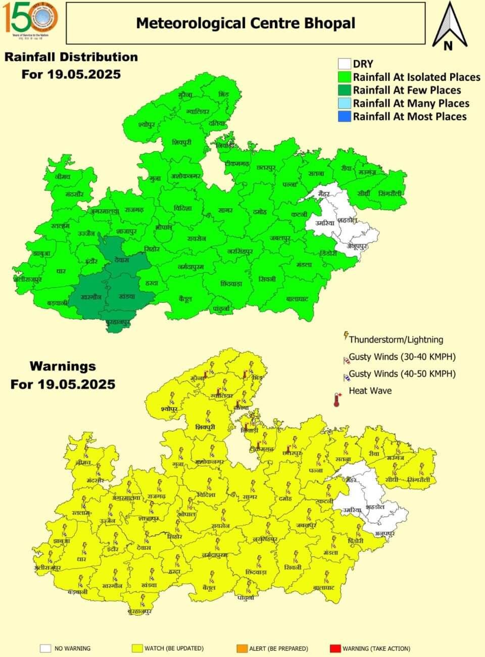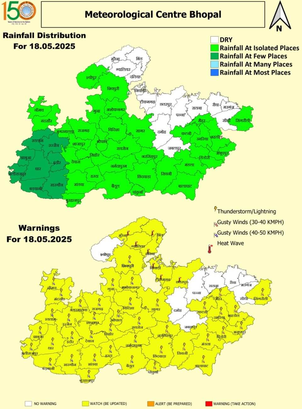- 18 मई रविवार: ग्वालियर, मुरैना, भिंड, दतिया, निवाड़ी, टीकमगढ़,छतरपुर में हीटवेव। इंदौर, भोपाल, उज्जैन, शिवपुरी, गुना, अशोकनगर, विदिशा, रायसेन, नर्मदापुरम, बैतूल, हरदा, सीहोर, राजगढ़, शाजापुर, देवास, खंडवा, बुरहानपुर, खरगोन, आगर-मालवा, नीमच, मंदसौर, रतलाम, झाबुआ, अलीराजपुर, बड़वानी, सागर, नरसिंहपुर, छिंदवाड़ा, पांढुर्णा, सिवनी, बालाघाट, मंडला, डिंडौरी, अनूपपुर, उमरिया, कटनी, शहडोल और सिंगरौली में तेज आंधी और बारिश ।
