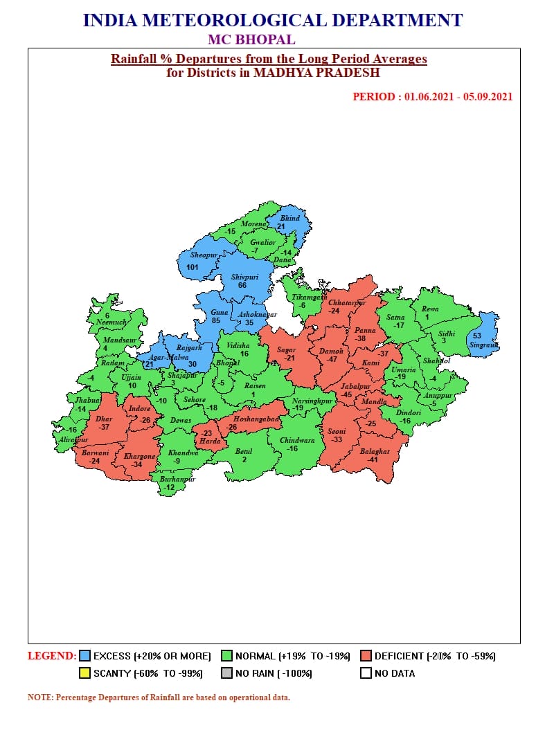 मौसम विभाग (MP Weather Forecast) की माने तो बंगाल की खाड़ी में बना लो प्रेशर एरिया अगले 24 घंटे में एक्टिव हो जाएगा, जिसके बाद सोमवार से भोपाल समेत अन्य जिलों में तेज बारिश होने के आसार है।वर्तमान में मानसून ट्रफ ग्वालियर और सतना से गुजर रही है।6 सितंबर के बाद से लगातार 4 दिन बारिश होगी।वही 7 और 8 सितंबर को भी प्रदेश के कई इलाकों में भारी बारिश की संभावना है।मध्यप्रदेश के 15 जिलों में अब भी सामान्य से 20 से लेकर 48 फीसद तक कम वर्षा हुई है।