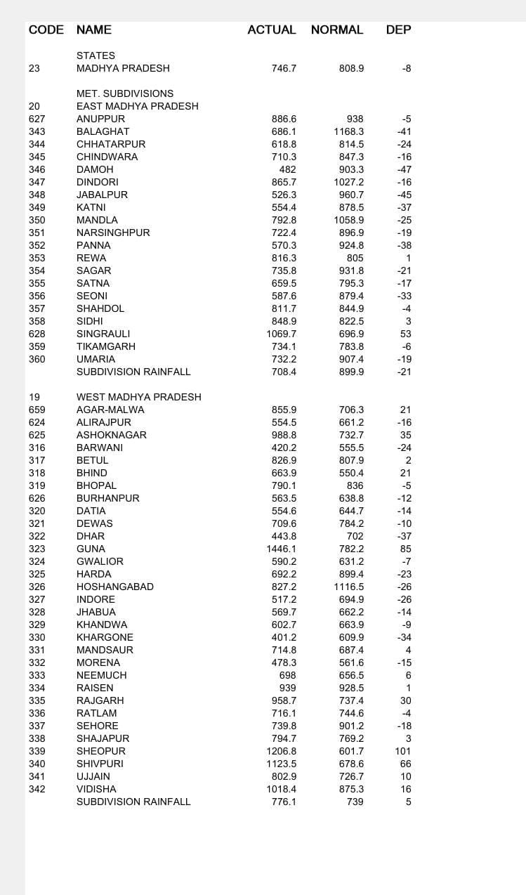 खजुराहो में 123.8, नौगांव में 34, दतिया 23.4, पचमढ़ी में 21, सिवनी में 18.4, सागर में 17.8, दमोह में 12, रीवा में सात, गुना में 5.2, रायसेन में पांच, खंडवा में चार, मलाजखंड में 3.6, टीकमगढ़ में तीन, छिंदवाड़ा में 2.4, सतना में 2.3, नरसिंहपुर में दो, जबलपुर में 0.8, भोपाल में 0.6, उमरिया में 0.4 मिलीमीटर बारिश हुई।
