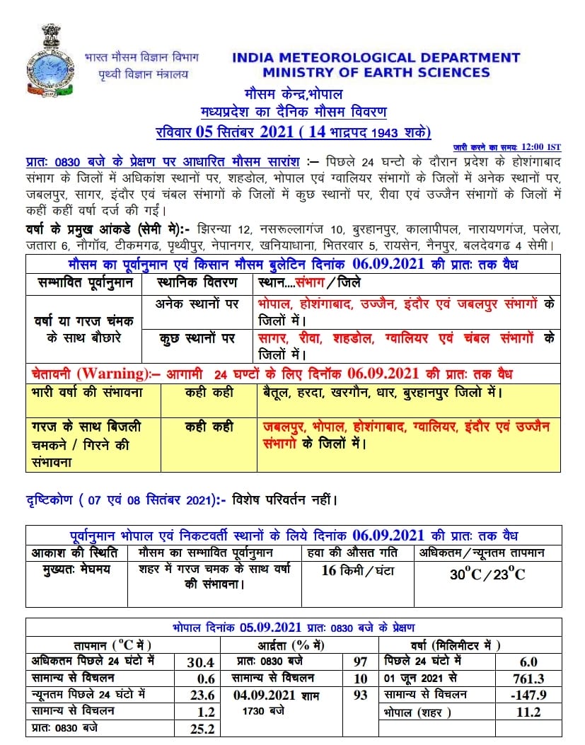 मौसम विभाग (MP Weather Today) ने आज शिक्षक दिवस (Teacher’s day) पर रविवार 5 सितंबर 2021 को सभी संभागों भोपाल, उज्जैन, इंदौर, होशंगाबाद, सागर, रीवा, ग्वालियर, चंबल, जबलपुर और शहडोल में कहीं-कहीं गरज-चमक के साथ बारिश की संभावना है। वही बैतूल, हरदा, धार, खरगोन और बुरहानपुर में भारी बारिश की संभावना जताते हुए येलो अलर्ट जारी किया है। वही जबलपुर, भोपाल, होशंगबाद, ग्वालियर, इंदौर और उज्जैन संभागों के जिलों में गरज के साथ बिजली चमकने और गिरने के लिए भी अलर्ट जारी किया गया है।