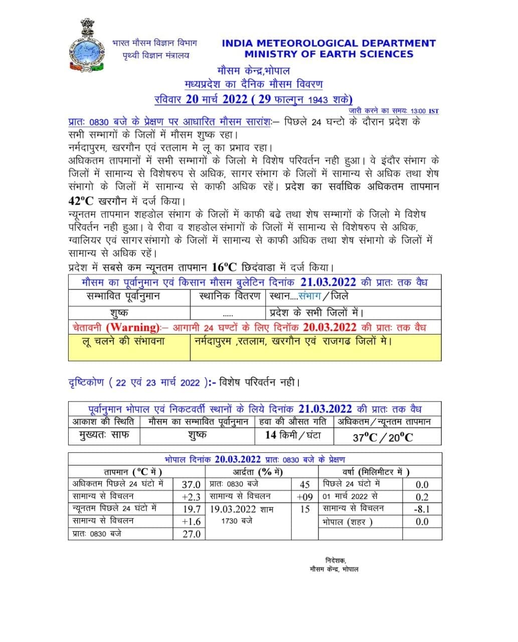 भोपाल, डेस्क रिपोर्ट।MP Weather. एकसाथ 4 सिस्टम एक्टिव होने से हवाओं के रूख और तापमान में लगातार उतार चढ़ाव हो रहा है।इस परिवर्तन के चलते मध्य प्रदेश (MP Weather Update Today 20 March 2022) के कई जिलों में लू का असर देखने को मिल रहा है। एमपी मौसम विभाग (MP Weather Department) ने आज 20 मार्च 2022 रविवार को कई जिलों में लू चलने के चलते येलो अलर्ट जारी किया गया है।वही 14 किमी/ घंटा की रफ्तार से हवा चलने की संभावना जताई है।इस महीने अंत में तापमान में एक बार फिर बढ़ोतरी देखने का मिलेगी।