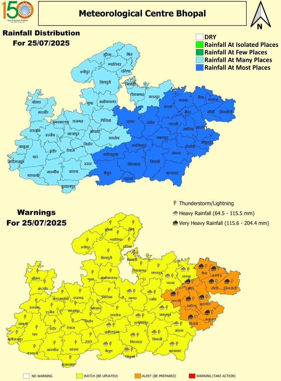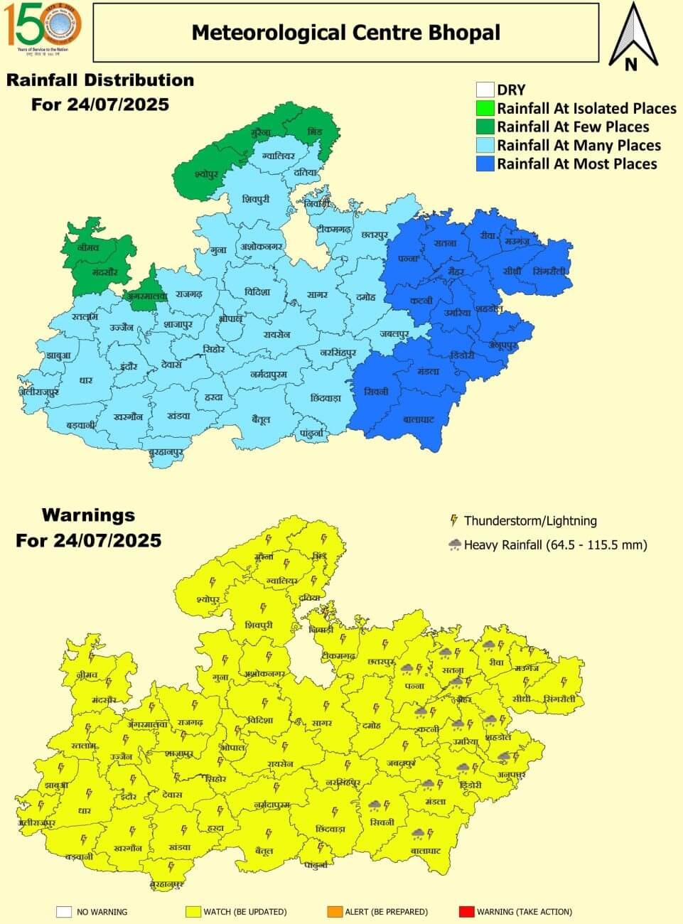 जबलपुर, श्योपुर, मुरैना, नर्मदापुरम, बैतूल, नरसिंहपुर, छिंदवाड़ा, पांढुर्णा, सागर, दमोह, सिवनी, मंडला, बालाघाट, डिंडौरी, अनूपपुर में अगले 24 घंटे में साढ़े 4 इंच तक पानी गिर सकता है। अन्य जिलों में गरज-चमक, आंधी और हल्की बारिश का दौर रहेगा।
