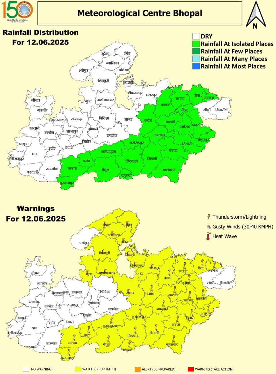 - 12 जून गुरूवार: ग्वालियर, भिंड, मुरैना, शिवपुरी, गुना,अशोकनगर, सागर, छतरपुर, टीकमगढ़ और निवाड़ी में हीटवेव। बुरहानपुर, खंडवा, हरदा, नर्मदापुरम, बैतूल, नरसिंहपुर, छिंदवाड़ा, पांढुर्णा, सिवनी, बालाघाट, मंडला, जबलपुर, डिंडौरी, अनूपपुर, शहडोल, उमरिया, कटनी, दमोह, पन्ना, सतना, रीवा, मैहर में आंधी-बारिश का अलर्ट ।