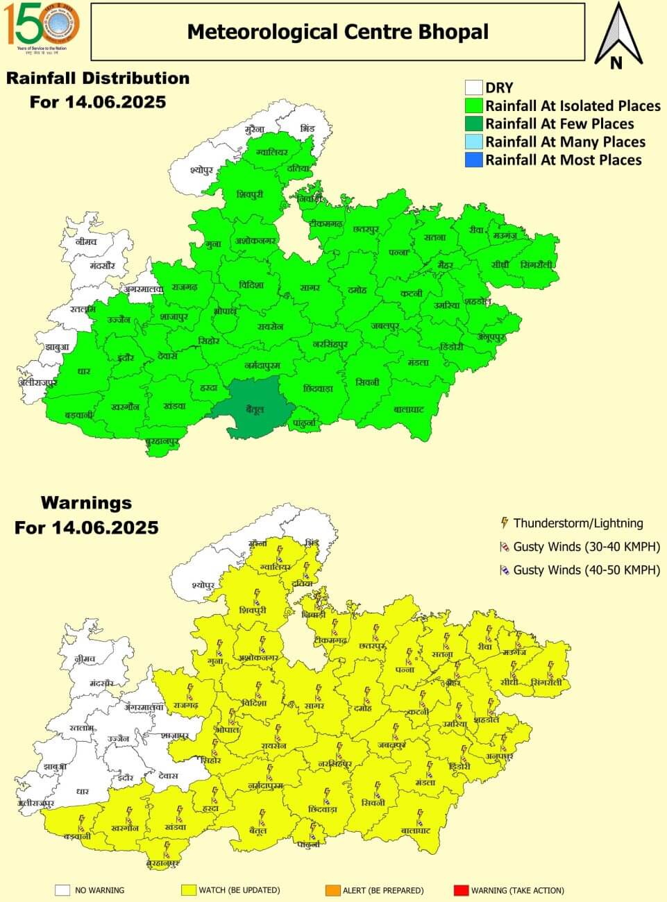 - 14 जून शनिवार: भोपाल, जबलपुर, ग्वालियर, बड़वानी,खरगोन, खंडवा, बुरहानपुर, हरदा, बैतूल, नर्मदापुरम, सीहोर, रायसेन, विदिशा, राजगढ़, अशोकनगर, गुना, शिवपुरी, निवाड़ी, टीकमगढ़, सागर, नरसिंहपुर, छिंदवाड़ा, पांढुर्णा, सिवनी, दमोह, छतरपुर, पन्ना, कटनी, मंडला, बालाघाट, डिंडौरी, अनूपपुर, उमरिया, शहडोल, मैहर, सीधी, सिंगरौली, मऊगंज, रीवा, सतना में आंधी-बारिश।