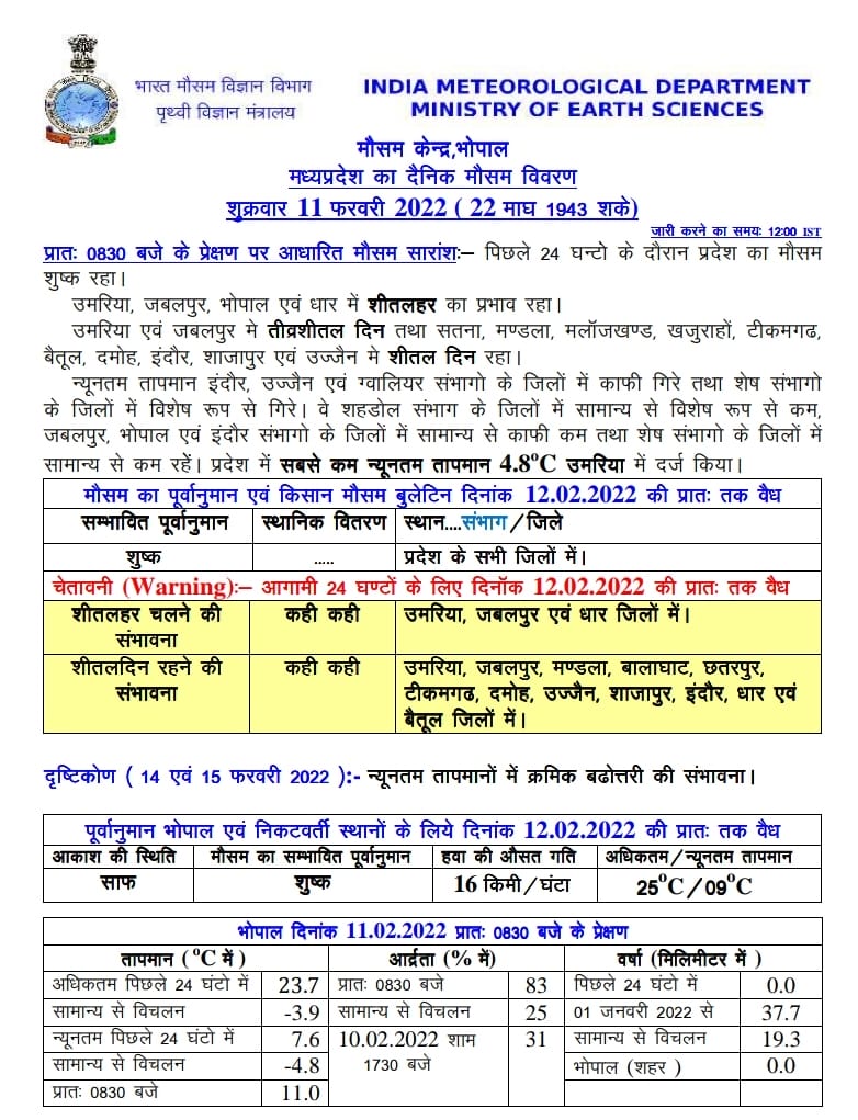 भोपाल, डेस्क रिपोर्ट। मध्य प्रदेश में ठंड का मौसम (MP Weather Update Today 11 February 2022) आखरी दौर में पहुंच गया है। पिछले 24 घंटे में सबसे न्यूनतम तापमान उमरिया में 4.8 डिग्री सेल्सियस दर्ज किया गया है। एमपी मौसम विभाग (MP Weather Department) ने आज 11 फरवरी 2022 को एक दर्जन जिलों में शीतलहर और कोल्ड डे रहने के चलते येलो अलर्ट जारी किया है। वही 16 किमी/घंटा की रफ्तार से हवा चलने की संभावना है।इधर 13 फरवरी को एक नए सिस्टम के एक्टिव होने के आसार है।