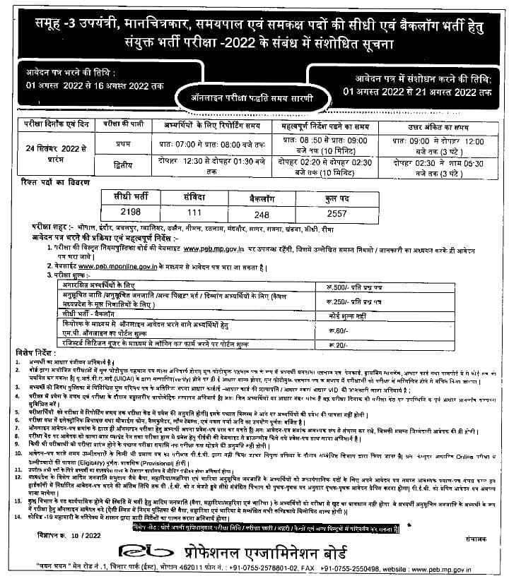 एमपीपीईबी ग्रुप 3 की परीक्षा 24 सितंबर से शुरू होगी। जिसके लिए भोपाल, इंदौर, जबलपुर, ग्वालियर, उज्जैन, नीमच, रतलाम, मंदसौर, सागर, खंडवा, सीधी, सतना और रीवा में परीक्षा केंद्र बनाया जाएगा।