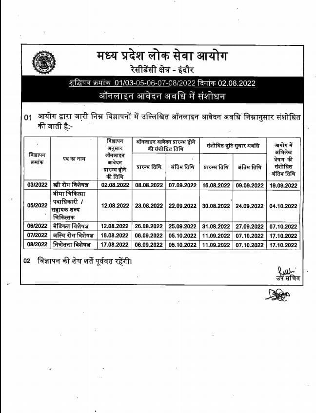 बता दे कि स्त्री रोग विशेषज्ञ संशोधन के बाद ऑनलाइन आवेदन करने की तिथि 8 अगस्त रखी गई है। वहीं आवेदन की अंतिम तिथि 7 सितंबर 2022 किया गया है जबकि MPPSC के अभिलेख परेशन करने की संशोधित अंतिम तिथि 19 सितंबर 2022 तय की गई है।