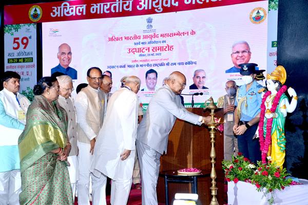 राष्ट्रपति रामनाथ कोविंद ने आज उज्जैन में अखिल भारतीय आयुर्वेद महासम्मेलन के 59वें अधिवेशन का शुभारंभ किया। उन्होंने शासकीय धनवंतरि आयुर्वेद चिकित्सा महाविद्यालय के भवन का वर्चुअल लोकार्पण भी किया। इस अवसर पर राज्यपाल श्री मंगुभाई पटेल ने महासम्मेलन की स्मारिका “अमृत कुंभ” का विमोचन किया। सीएम शिवराज द्वारा पाँच आयुर्वेदिक चिकित्सा विशेषज्ञों वैद्य बनवारीलाल, वैद्य मनोज, वैद्य राकेश शर्मा, वैद्य जयप्रकाश एवं वैद्य गोपालदास मेहता को ‘आयुर्वेद महर्षि’ की मानद उपाधि से सम्मानित किया। उन्होंने वैद्य देवेन्द्र त्रिगुणा को आयुर्वेद के क्षेत्र में ‘लाइफ टाइम अचीवमेंट’ अवार्ड दिया।