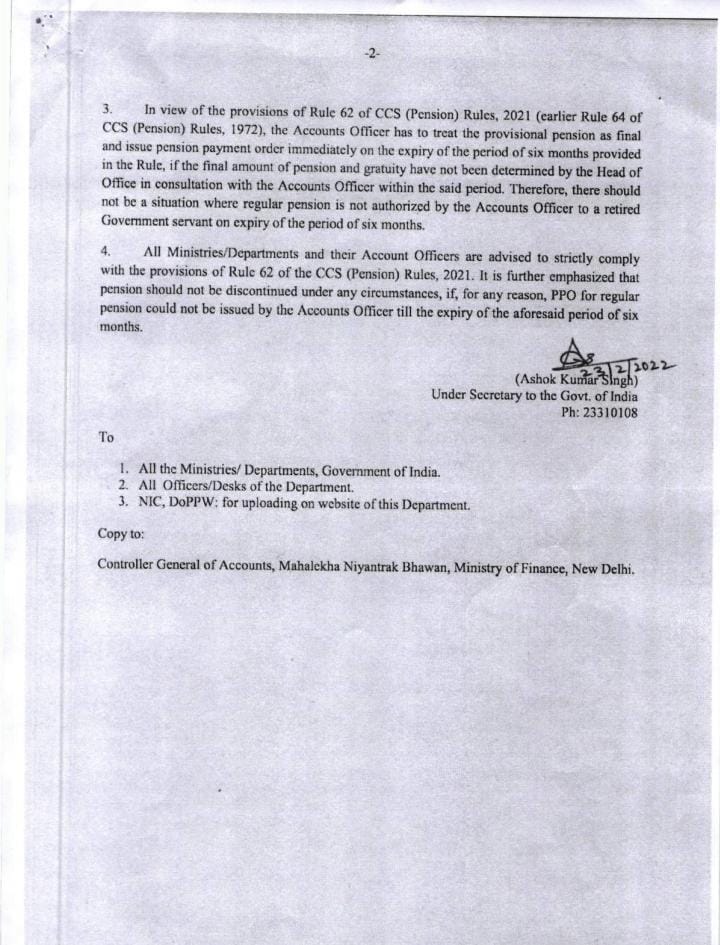 पेंशन और पेंशनभोगी कल्याण विभाग (डीओपीपीडब्ल्यू) पेंशन भुगतान आदेश (पीपीओ) जारी करने में देरी की स्थिति में केंद्रीय सिविल सेवा (पेंशन) नियम, 2021 के नियम 62 के तहत अनंतिम पेंशन और ग्रेच्युटी के भुगतान को स्पष्ट करता है। इससे पहले 23 फरवरी, 2022 को जारी एक आधिकारिक ज्ञापन में नियमित पेंशन को अधिकृत करने का आदेश दिया गया था। प्रत्येक पेंशनभोगी का 12 अंकों का पीपीओ नंबर अद्वितीय है और पेंशन प्राप्त करने के लिए संदर्भ संख्या के रूप में उपयोग किया जाता है।