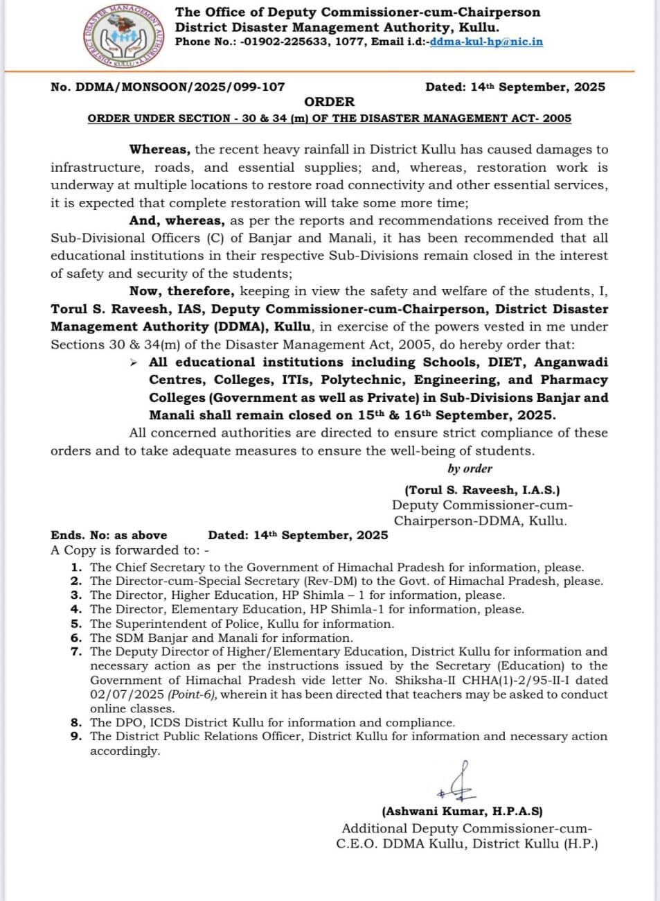 SCHOOL HOLIDAYS : स्कूली छात्रों के लिए अच्छी खबर है। हिमाचल प्रदेश के कुल्लू जिले के उपमंडल मनाली और बंजार में 15 और 16 सितंबर 2025 को सभी सरकारी व गैर सरकारी शिक्षण संस्थान बंद रहेंगे। विश्वकर्मा पूजा के अवसर पर उत्तर प्रदेश के भी सभी परिषदीय और मान्यता प्राप्त बेसिक विद्यालय 17 सितंबर बुधवार को बंद रहेंगे।यह अवकाश सभी छात्रों और शिक्षकों के लिए मान्य होगी।इधर, उत्तरी कश्मीर के बारामुला जिले के कुंजर अंचल के सरकारी माध्यमिक विद्यालय खोंचीपोरा में चिकनपाक्स के मामले आने के बाद छात्रों के स्वास्थ्य को देखते हुए संस्थान में कक्षाएं तत्काल प्रभाव से स्थगित कर दी गई हैं। यह निलंबन अगले निर्देश जारी होने तक लागू रहेगा।पूणे में भारी बारिश और सड़कों पर जलभराव के कारण स्थानीय स्कूल प्रशासन ने आज सोमवार को कई स्कूलों में अवकाश घोषित किया है।