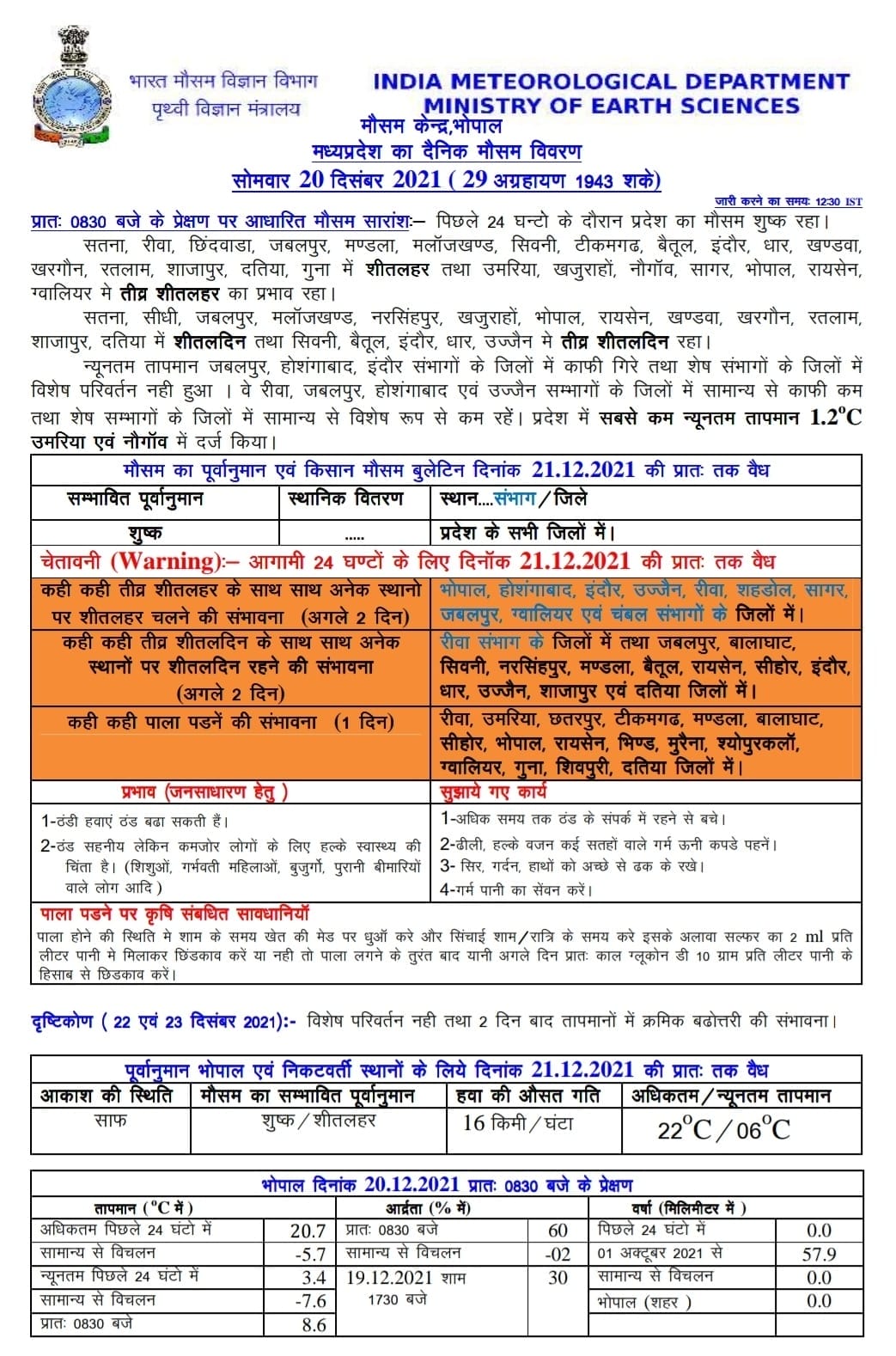 एमपी मौसम विभाग (MP Weather Forecast)ने आज सोमवार 20 दिसंबर 2021 को भोपाल, इंदौर, उज्जैन, सागर, जबलपुर, रीवा,ग्वालियर, चंबल, होशंगाबाद और शहडोल संभागों के जिलों में दो दिन तक तीव्र शीतलहर चलने का ऑरेंज अलर्ट जारी किया गया है। वही रीवा, उमरिया, छतरपुर, टीकमगढ़, मंडला, बालाघाट, सीहोर, भोपाल, रायसेन, भिंड, मुरैना, श्योपुर, ग्वालियर, शिवपुरी, गुना और दतिया जिलों में पाला पड़ने का ऑरेंज अलर्ट जारी किया गया है।इसके साथ ही 16किमी/ घंटा की रफ्तार चलने के आसार है।