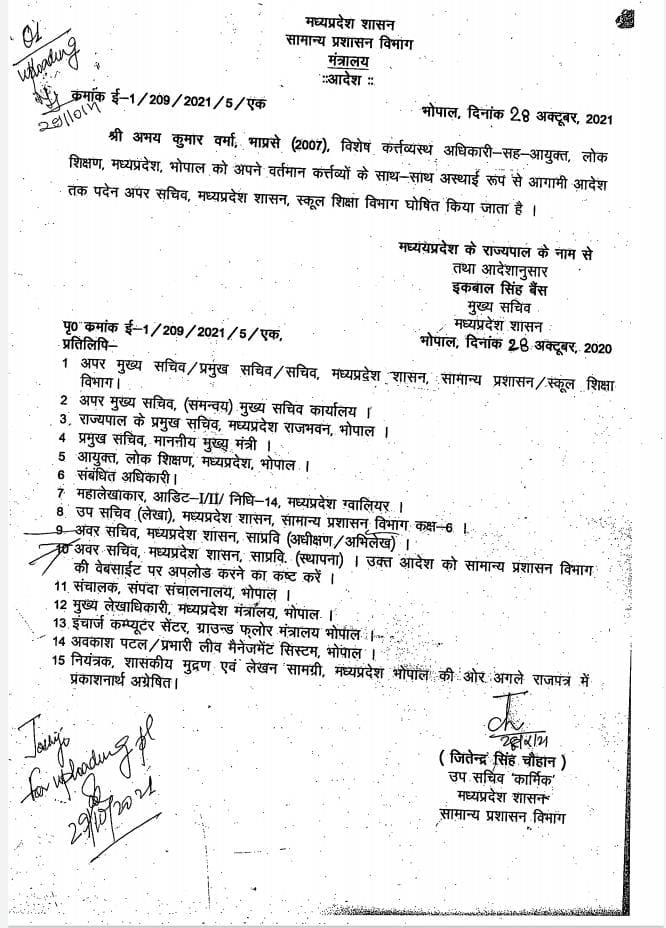 वही भारतीय प्रशासनिक सेवा के स्वाति मीणा नायक, प्रबंध संचालक, महिला वित्त एवं विकास निगम भोपाल को अपर सचिव, मध्य प्रदेश शासन, महिला एवं बाल विकास विभाग भेजा गया है। जबकि IAS अभय कुमार वर्मा, विशेष कर्तव्यस्थ अधिकारी सह आयुक्त, लोक शिक्षण मध्यप्रदेश भोपाल को अपर सचिव, मध्य प्रदेश शासन, स्कूल शिक्षा विभाग नियुक्त किया गया है।