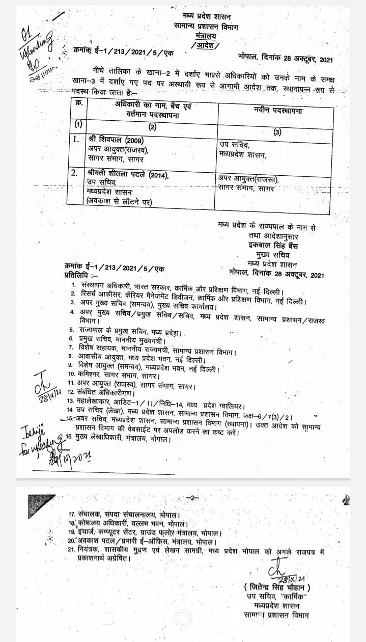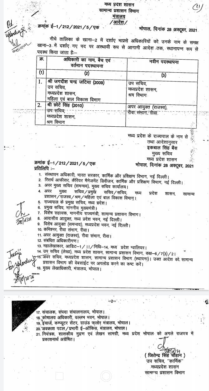 इसके अलावा जगदीश चंद्र जटिया, मध्य प्रदेश शासन उप सचिव, महिला एवं बाल विकास विभाग को मध्यप्रदेश शासन श्रम विभाग के उप सचिव नियुक्त किया गया है। वहीं IAS छोटे सिंह, श्रम विभाग, उप सचिव को रीवा संभाग राजस्व का अपर आयुक्त नियुक्त किया गया है।