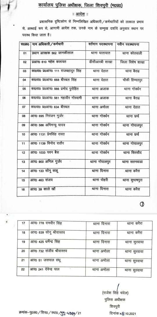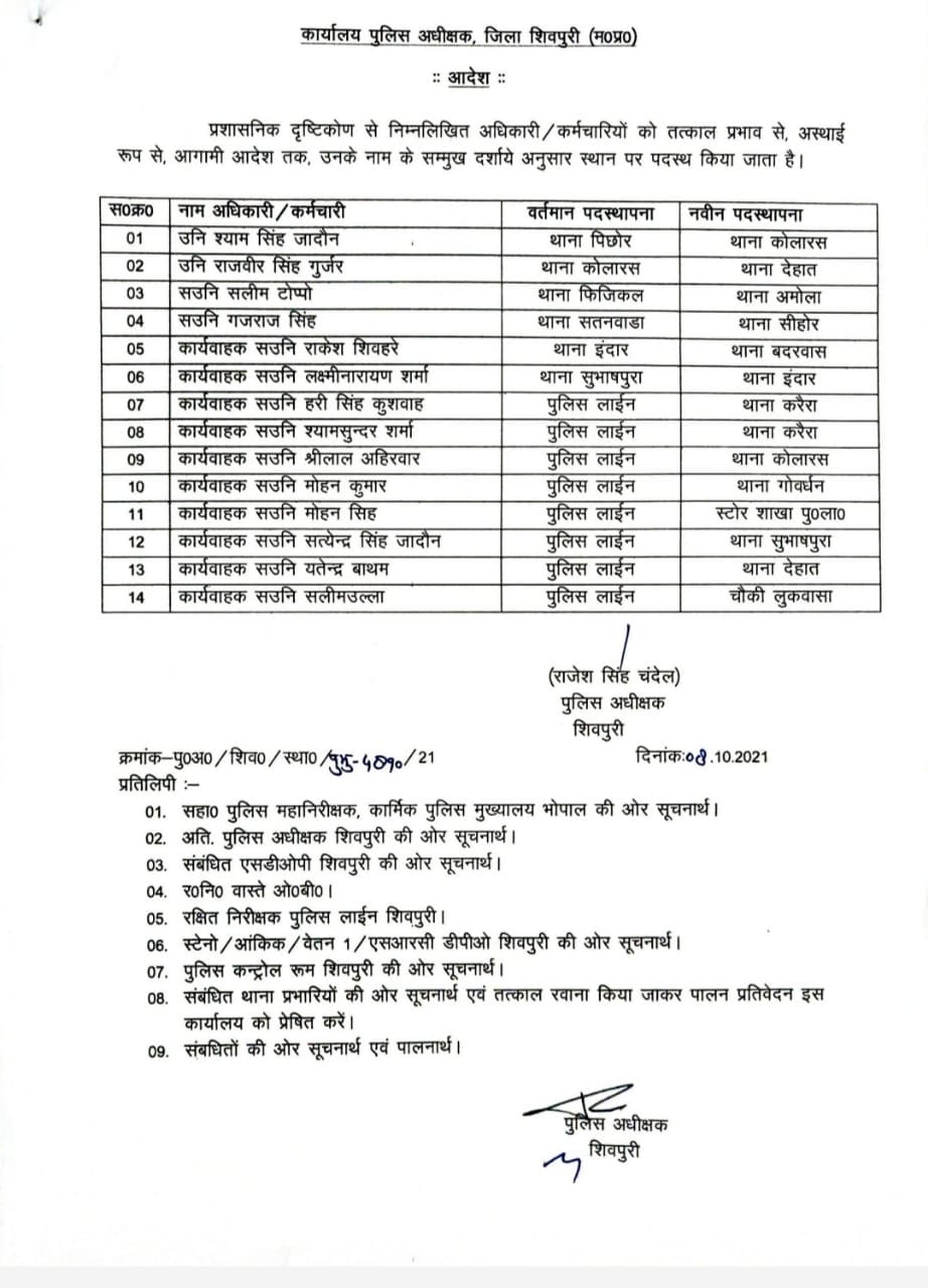 इसी कड़ी में आज शिवपुरी जिले में पुलिस अधीक्षक राजेश सिंह चंदेल ने बड़ा फेरबदल किया है। इस संबंध में कार्यालय पुलिस अधीक्षक ने आदेश जारी कर दिए है।