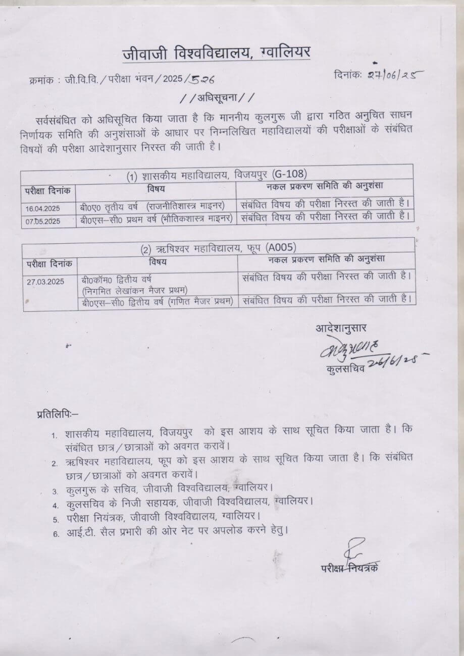 जीवाजी विश्वविद्यालय ने श्योपुर जिले में स्थित शासकीय महाविद्यालय विजयपुर में 16 अप्रैल 2025 को आयोजित बी ए अंतिम वर्ष (राजनीति शास्र माइनर) और बीएस सी प्रथम वर्ष (भौतिक शास्त माइनर) की परीक्षाओं को निरस्त कर दिया है।