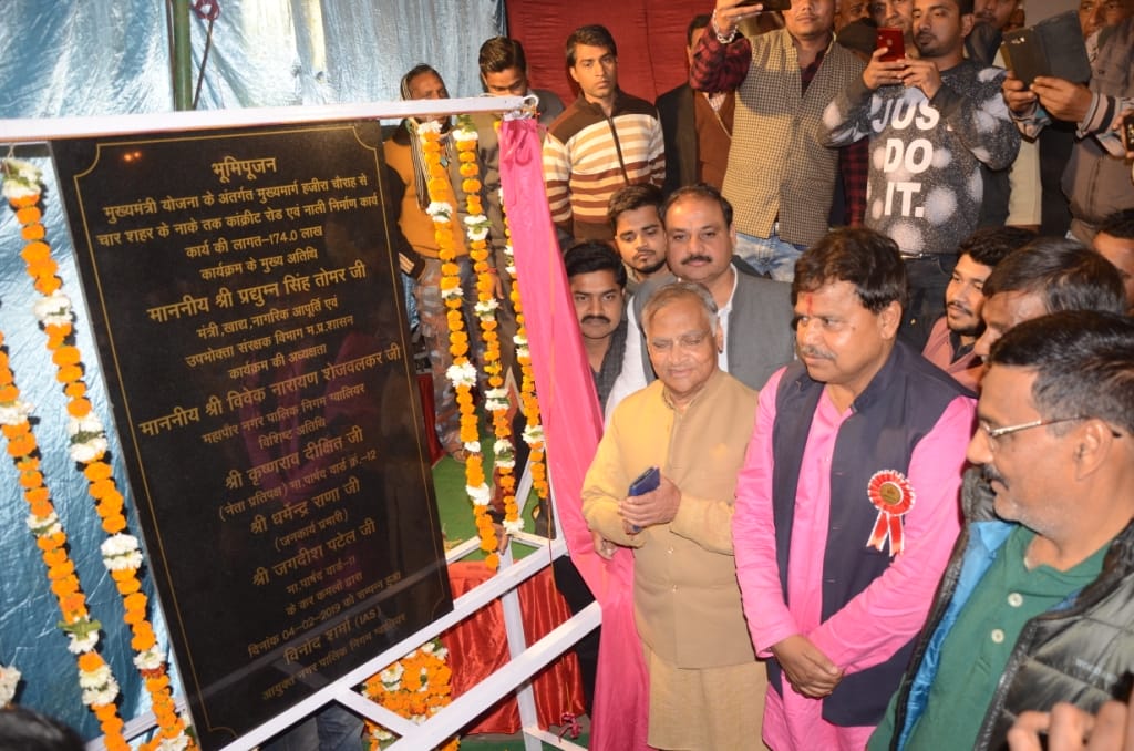 सोमवार को प्रदेश के खाद्य, नागरिक आपूर्ति एवं उपभोक्ता संरक्षण मंत्री प्रद्युम्न सिंह तोमर ने मुख्यमंत्री अधोसंरचना मद से एक करोड़ 74 लाख रूपए की लागत से बनने वाली हजीरा से चार शहर का नाका तक की सड़क का भूमिपूजन किया । उन्होंने इस अवसर पर पिछली सरकार पर उंगली ना उठाते हुए मंत्री प्रद्युम्न सिंह तोमर ने कहा है कि शहर के विकास का कार्य सभी के सहयोग से किया जायेगा। ग्वालियर को स्वच्छ और सुंदर शहर बनाने में कोई कोर कसर नहीं छोड़ी जायेगी। शहर के विकास के लिए प्रदेश सरकार और केन्द्र सरकार से भी सहयोग लिया जायेगा। कार्यक्रम की अध्यक्षता महापौर विवेक नारायण शेजवलकर ने की। इस मौके पर विशेष अतिथि के रूप में नेता प्रतिपक्ष कृष्णराव दीक्षित एमआईसी सदस्य धर्मेन्द्र राणा, क्षेत्रीय पार्षद जगदीश पटेल सहित जनप्रतिनिधि और गणमान्य नागरिक उपस्थित थे।