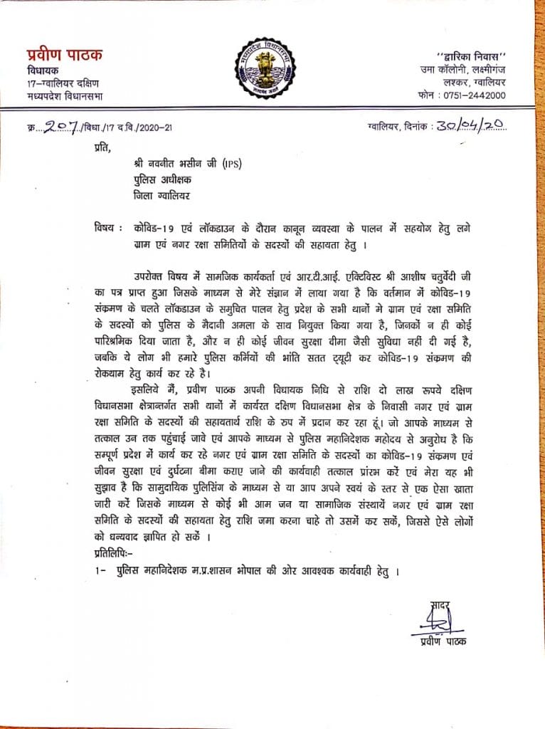 कोरोना (corona) महामारी में लॉक डाउन (lockdown) के दौरान कानून व्यवस्था के पालन में सहयोग हेतु लगे हुए ग्राम एवं नगर रक्षा समितियों के सदस्यों की सहायता करने के लिए ग्वालियर दक्षिण विधायक (MLA) प्रवीण पाठक (pravin pathak) ने अपनी विधायक निधि से दो लाख रुपये (2 lakh) की सहायता राशि (relief fund) दी है। विधायक पाठक ने अपनी सहायता राशि देने के लिए ग्वालियर पुलिस अधीक्षक नवनीत भसीन को पत्र लिखकर इसकी जानकारी दी है ।