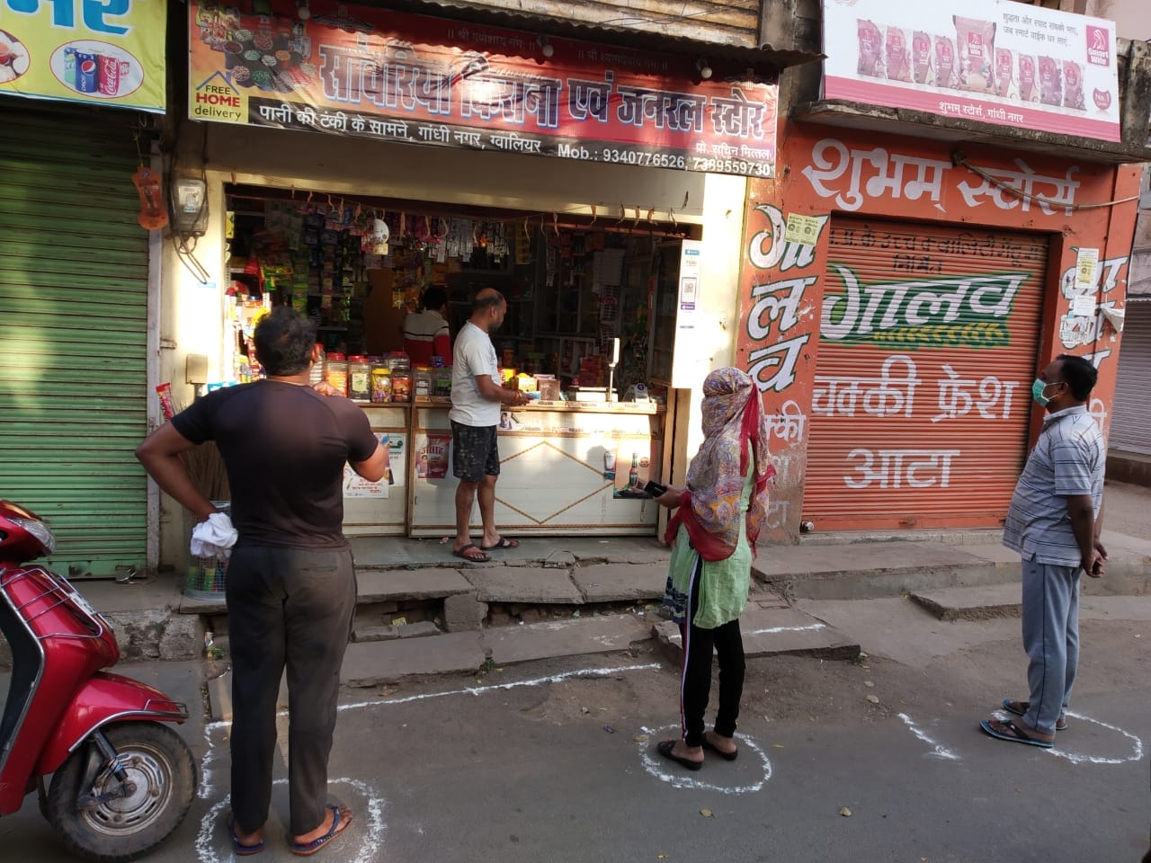 प्रधानमंत्री नरेंद्र मोदी द्वारा की जा रही सोशल डिस्टेंसिंग की अपील का अब शहर के लोगों पर असर होने लगा है। दुकानदार अपनी दुकान के सामने सड़क पर गोले लगा रहे हैं और ग्राहकों से कह रहे हैं कि जो सोशल डिस्टेंस का उल्लंघन करेगा उसे सामान नहीं मिलेगा।