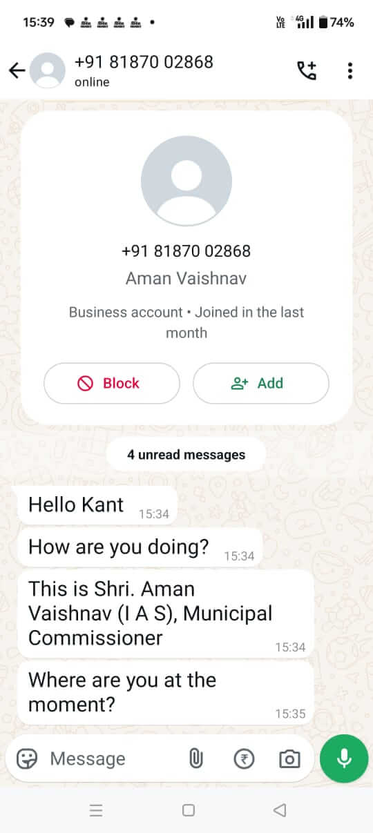 Gwalior News : साइबर अपराधी बड़े ही शातिराना तरीके से अब अधिकारियों के नाम से उनके मातहतों को ठगने की प्लानिंग करने लगे हैं, एक ऐसा ही मामला ग्वालियर में सामने आया है, ग्वालियर नगर निगम के कमिश्नर अमन वैष्णव के नाम से किसी अंजान नंबर से निगम अधिकारियों के पास मैसेज पहुंचे तो वहां हडकंप मच गया, मैसेज में पूछा गया तुम कहाँ हो और क्या कर रहे हो, मैसेज करने वाले ने खुद को कमिश्नर IAS अमन वैष्णव बताया।