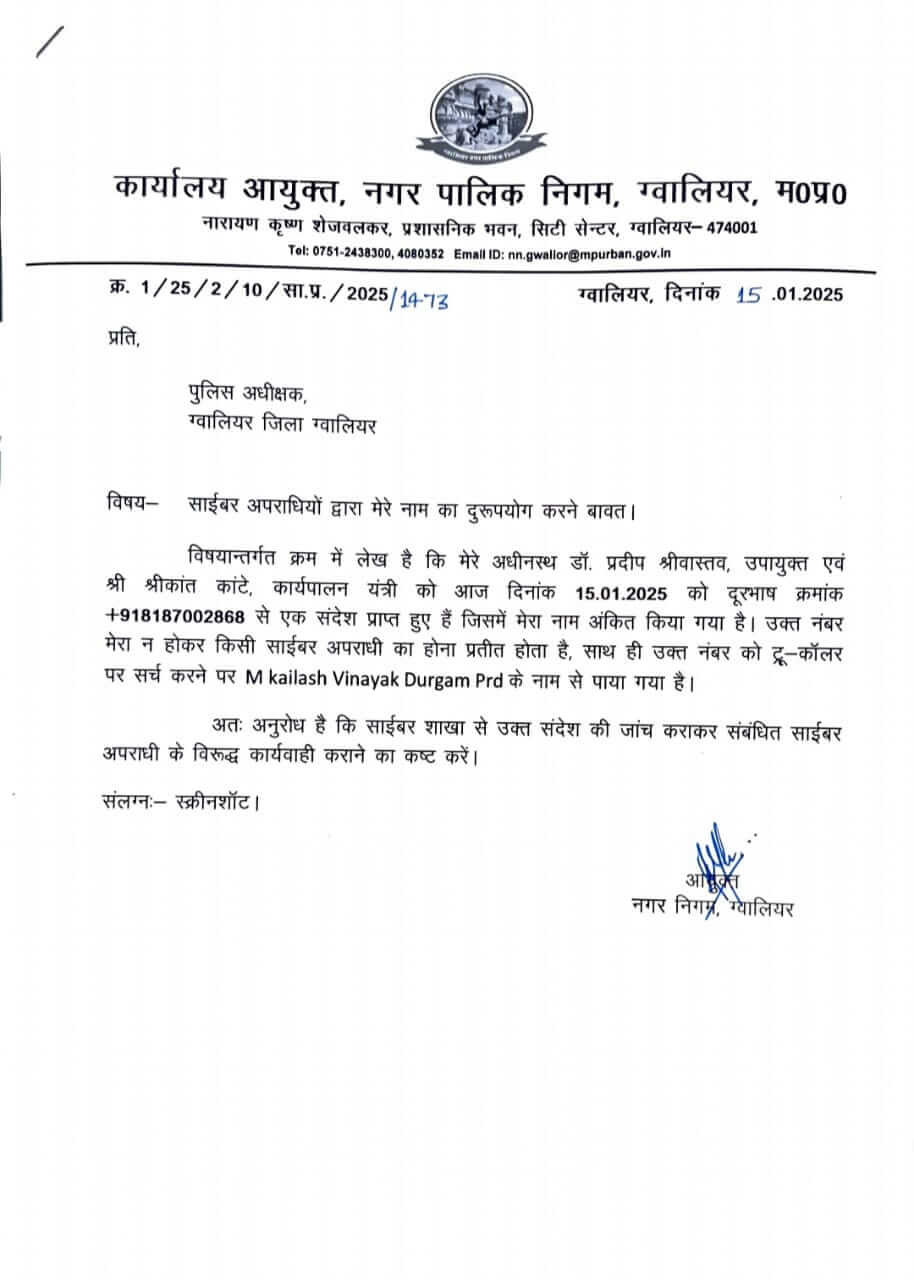 कमिश्नर अमन वैष्णव के नाम से नगर निगम अधिकारियों को भेजे जा रहे मैसेज, ग्वालियर एसपी से शिकायत