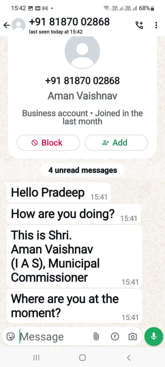 एसपी को भेजी शिकायत में कमिश्नर ने कहा आज 15 जनवरी को मेरे अधीनस्थों को जिस नंबर 8187002868 से मेरे नाम से मैसेज भेजे जा रहे हैं वो किसी अपराधी का हो सकता है,कृपया जाँच कर कार्यवाही करें।
