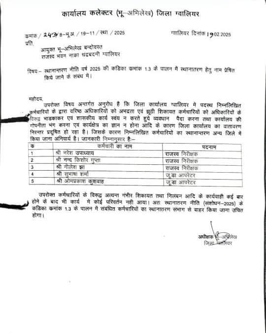 कलेक्टर के आदेश के बाद एसएलआर रवि नंदन तिवारी ने कमिश्नर लैंड रिकॉर्ड को तीन राजस्व निरीक्षकों और दो कर्मचारियों के तबादले की अनुशंसा की है, एस एल आर ने पत्र में राजस्व निरीक्षक नरेश उपाध्याय, राजस्व निरीक्षक नंद किशोर गुप्ता, राजस्व निरीक्षक नीलेश झा, जूडा ऑपरेटर सुभाष शर्मा और जूडा ऑपरेटर ओमप्रकाश कुशवाह का तबादला ग्वालियर कलेक्टर कार्यालय से कहीं और करने की अनुशंसा की है।