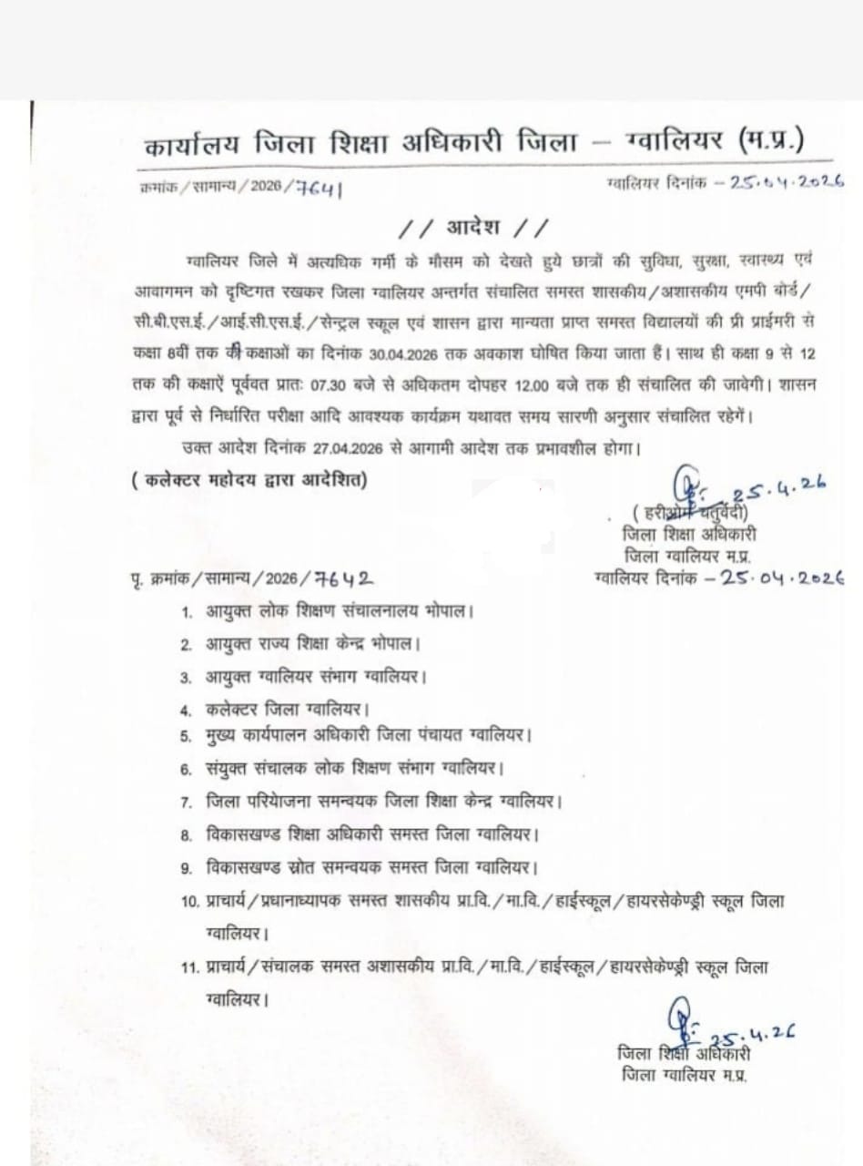 ग्वालियर कलेक्टर रुचिका चौहान के निर्देश पर जिला शिक्षा अधिकारी हरिओम चतुर्वेदी ने ग्वालियर जिले में संचालित सभी शासकीय/अशासकीय/एमपी बोर्ड/सीबीएसई बोर्ड/सेन्ट्रल स्कूल सहित अन्य स्कूलों में कक्षा प्री प्राईमरी से कक्षा 8वीं तक के विद्यार्थियों के लिए 30 अप्रैल तक छुट्टी घोषित कर दी है। जिला शिक्षा अधिकारी ने आदेश में लिखा है कि कक्षा 9वीं से 12वीं तक की कक्षाएं सुबह 7:30 से 12 बजे तक ही लगाई जा सकेंगी।