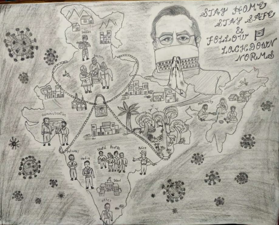 कोरोना को हराने के लिए लॉक डाउन और सोशल डिस्टेंसिंग दो बड़े उपाय बताये गए हैं। इसीलिए प्रधानमंत्री सहित मध्यप्रदेश के मुख्यमंत्री और प्रशासनिक अधिकारी शहर के लोगों से लॉक डाउन का पालन करने की अपील कर रहे हैं। इन सबके बीच लॉक डाउन की अपील करता एक पेंसिल स्केच भी चर्चा में आ गया है। ये स्केच बनाया है ग्वालियर की एक महिला पटवारी ने। उन्होंने इसमें “घर में रहे, सुरक्षित रहें, लॉक डाउन के नियमों का पालन करें” की अपील की है।