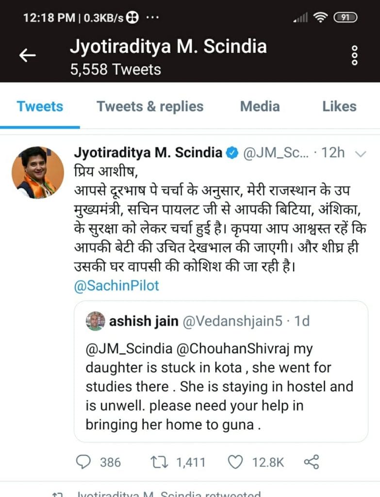 सिंधिया (scindia) के संसदीय क्षेत्र गुना (guna) के रहने वाले आशीष जैन (ashish jain) ने अपनी बेटी अंशिका anshika) को राजस्थान के कोटा (kota) से वापस घर लाने के लिए मुख्यमंत्री शिवराज सिंह चौहान (shivraj singh chauhan) और पूर्व केंद्रीय मंत्री ज्योतिरादित्य सिंधिया (scindia) को ट्वीट किया था। मुख्यमंत्री शिवराज सिंह इस ट्वीट पर कोई प्रतिक्रिया नहीं दे पाए जबकि सिंधिया ने राजस्थान के उप मुख्यमंत्री सचिन पायलट से फोन पर बात की और आशीष जैन को भरोसा दिलाया कि जल्द ही उनकी बेटी घर लौट आयेगी।