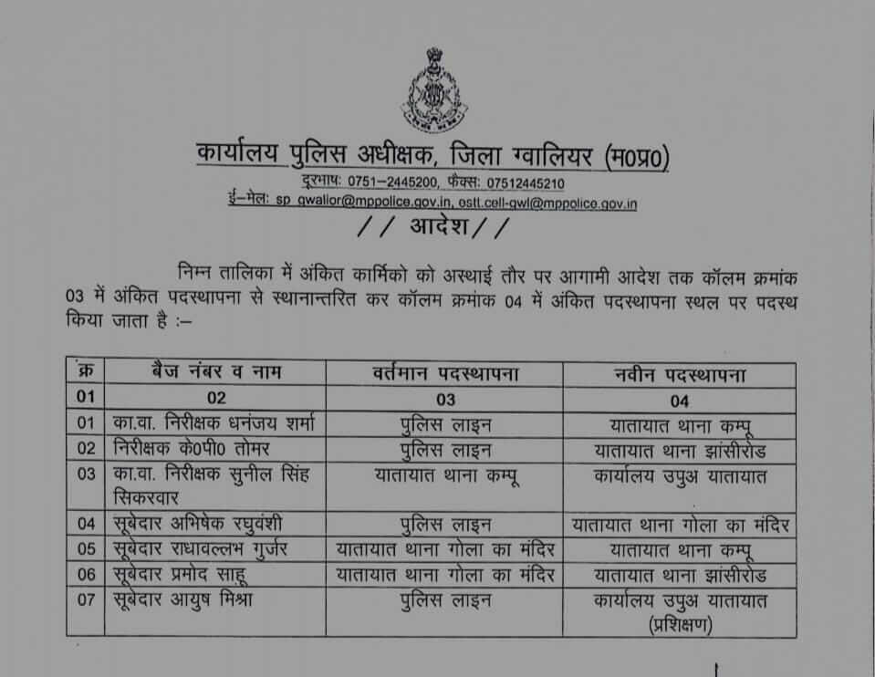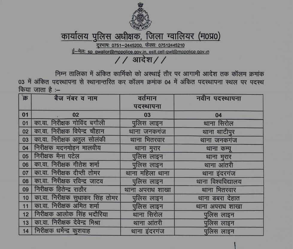 ग्वालियर पुलिस अधीक्षक धर्मवीर सिंह ने आज दो अलग अलग आदेश जारी कर पुलिस अधिकारियों के तबादले किये हैं, इस तबादला सूची में निरीक्षक, कार्यवाहक निरीक्षक और सूबेदारों के नाम शामिल हैं।