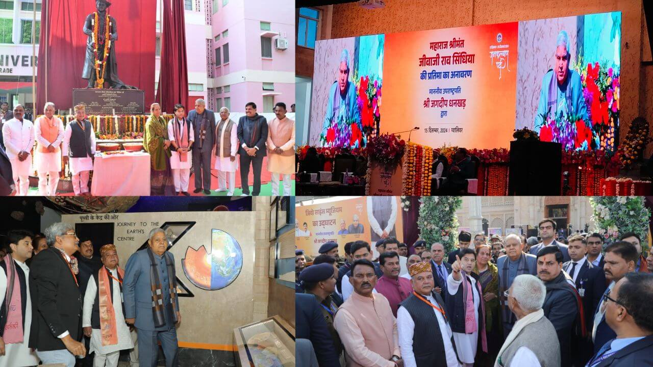 Gwalior News : आज ग्वालियर में महाराज श्रीमंत जीवाजी राव सिंधिया की प्रतिमा का अनावरण कार्यक्रम आयोजित किया गया था, जिसमें भारत के उपराष्ट्रपति जगदीप धनखड़ बतौर मुख्य अतिथि शामिल हुए। इस दौरान उन्होंने ग्वालियरवासियों को इस अनूठी सौगात दी है। दरअसल, उपराष्ट्रपति ने देश के पहले जियो साइंस म्यूजियम का उद्घाटन किया है। साथ ही वहां मौजूद सभी लोगों को बधाई और शुभकामनाएं दीं। इस खास मौके पर राज्यपाल मंगुभाई पटेल, मुख्यमंत्री डॉ. मोहन यादव, केंद्रीय संचार व पूर्वोत्तर क्षेत्र विकास मंत्री ज्योतिरादित्य सिंधिया, केंद्रीय कोयला व खान राज्य मंत्री सतीश चंद्र दुबे, विधानसभा अध्यक्ष नरेन्द्र सिंह तोमर, जिला प्रभारी एवं जल संसाधन मंत्री तुलसीराम सिलावट, सांसद भारत सिंह कुशवाह सहित अन्य गणमान्य उपस्थित रहे।