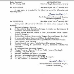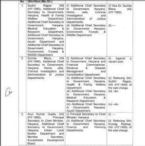 - अरुण कुमार (IAS 1992): मुख्यमंत्री कार्यालय में प्रिंसिपल सेक्रेटरी और वित्त एवं आयोजना विभाग में अतिरिक्त मुख्य सचिव नियुक्त किया गया है। अब तक सीएमओ के साथ-साथ हरियाणा अरबन लोकल बॉडीज के अतिरिक्त मुख्य सचिव की जिम्मेदारी संभाल रहे थे।