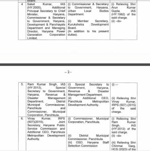 - विनय कुमार (IRPS 2015): नगर निगम पंचकूला में आयुक्त, जिला नगर आयुक्त, पंचकूला और हरियाणा स्टाफ सलेक्शन कमीशन में ओएसडी बनाया गया है।