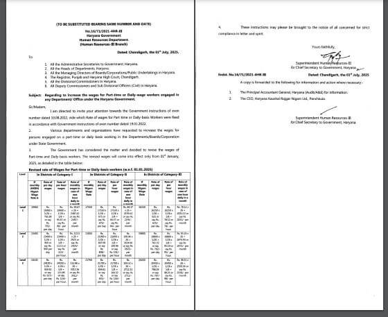 Harayana minimum wage hike :हरियाणा के हजारों अंशकालिक एवं दैनिक वेतनभोगी कर्मचारियों के लिए खुशखबरी है। सरकारी कर्मचारियों पेंशनर्स का महंगाई भत्ता बढ़ाने के बाद राज्य की नायब सिंह सैनी सरकार ने इन वर्कर्स के वेतन में बढ़ोतरी कर दी है। नई संशोधित वेतन संरचना 1 जनवरी 2026 से प्रभावी होगी। इस संबंध में मुख्य सचिव अनुराग रस्तोगी ने आदेश भी जारी कर दिया है। यह आदेश सभी सरकारी विभागों, बोर्ड्स, कॉरपोरेशन्स और पब्लिक सेक्टर यूनिट्स में काम कर रहे अस्थायी और दैनिक वेतनभोगी कर्मचारियों पर लागू होगा।