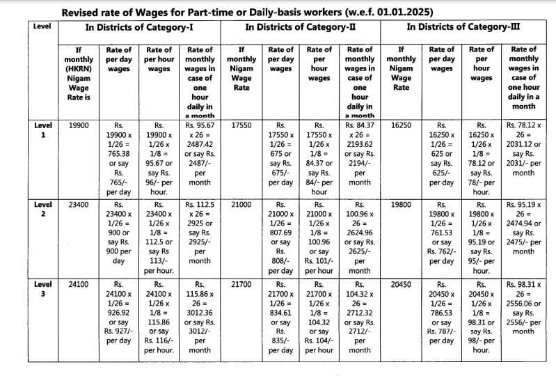 - स्तर-3 के कर्मचारियों को वेतन: जिलों में स्तर-1 के लिए 16,250 रुपये महीना, 625 रुपये दिन और 78 रुपये प्रति घंटा वेतन मिलेगा। स्तर-2 पर 19,800 रुपये महीना, 762 रुपये दिन और 95 रुपये प्रति घंटा, जबकि स्तर-3 पर 20,450 रुपये महीना, 787 रुपये दिन और 98 रुपये प्रति घंटा वेतन तय किया गया है।