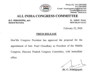 हरियाणा कांग्रेस ने रविवार को एक महत्वपूर्ण नियुक्ति करते हुए वकील पर्ल चौधरी को प्रदेश महिला कांग्रेस की नई अध्यक्ष नियुक्त किया है। कांग्रेस महासचिव के.सी. वेणुगोपाल की ओर से जारी आधिकारिक पत्र के अनुसार, पर्ल चौधरी अब इस पद पर सुधा भारद्वाज की जगह लेंगी। इस नियुक्ति को राज्य में पार्टी संगठन को मजबूत करने की दिशा में एक अहम कदम माना जा रहा है।