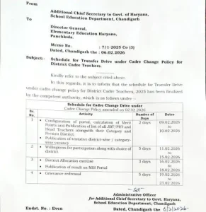 हरियाणा में प्राथमिक शिक्षकों के तबादलों को लेकर राज्य सरकार ने व्यापक शेड्यूल जारी कर दिया है। डिस्ट्रिक्ट कैडर में कार्यरत JBT, PRT और प्रधानाध्यापकों के लिए लागू इस कैडर चेंज पॉलिसी 2025 में कई अहम बदलाव किए गए हैं जो पहले की नीति से अलग हैं।