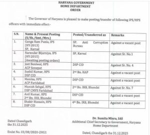 हरियाणा की नायब सैनी सरकार ने पुलिस विभाग में फेरबदल किया गया है। नए पुलिस महानिदेशक (DGP) की नियुक्ति के साथ राज्य सरकार ने 31 दिसंबर 2025, बुधवार को भारतीय पुलिस सेवा (IPS) के 2 और हरियाणा पुलिस सेवा के 6 अधिकारियों (HPS) के तबादले किए हैं। इस संबंध में गृह विभाग ने आदेश जारी कर दिए हैं।
