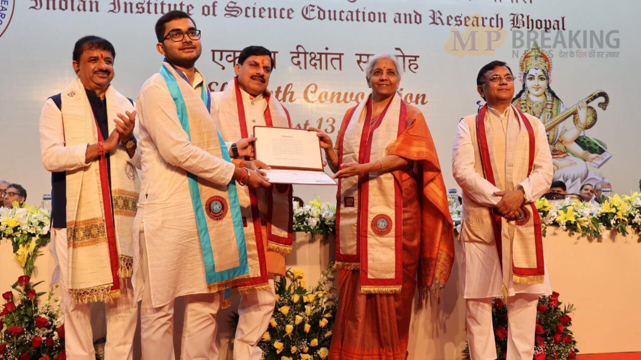IISER Bhopal 11th Convocation Ceremony : भोपाल में आज भारतीय विज्ञान शिक्षा एवं अनुसंधान संस्थान (Indian Institute of Science Education and Research Bhopal) का 11वां दीक्षांत समारोह मनाया गया। कार्यक्रम में मुख्यमंत्री डॉ. मोहन यादव और केंद्रीय वित्त मंत्री निर्मला सीतारमण शामिल हुए। उन्होंने 442 छात्र-छात्राओं को डिग्री प्रदान की। इस अवसर पर सांसद वीडी शर्मा, सांसद आलोक शर्मा सहित अन्य जनप्रतिनिधि भी उपस्थित रहे।
