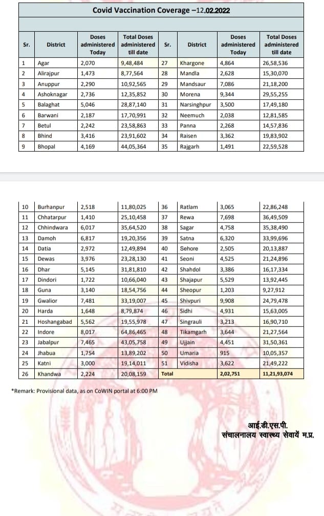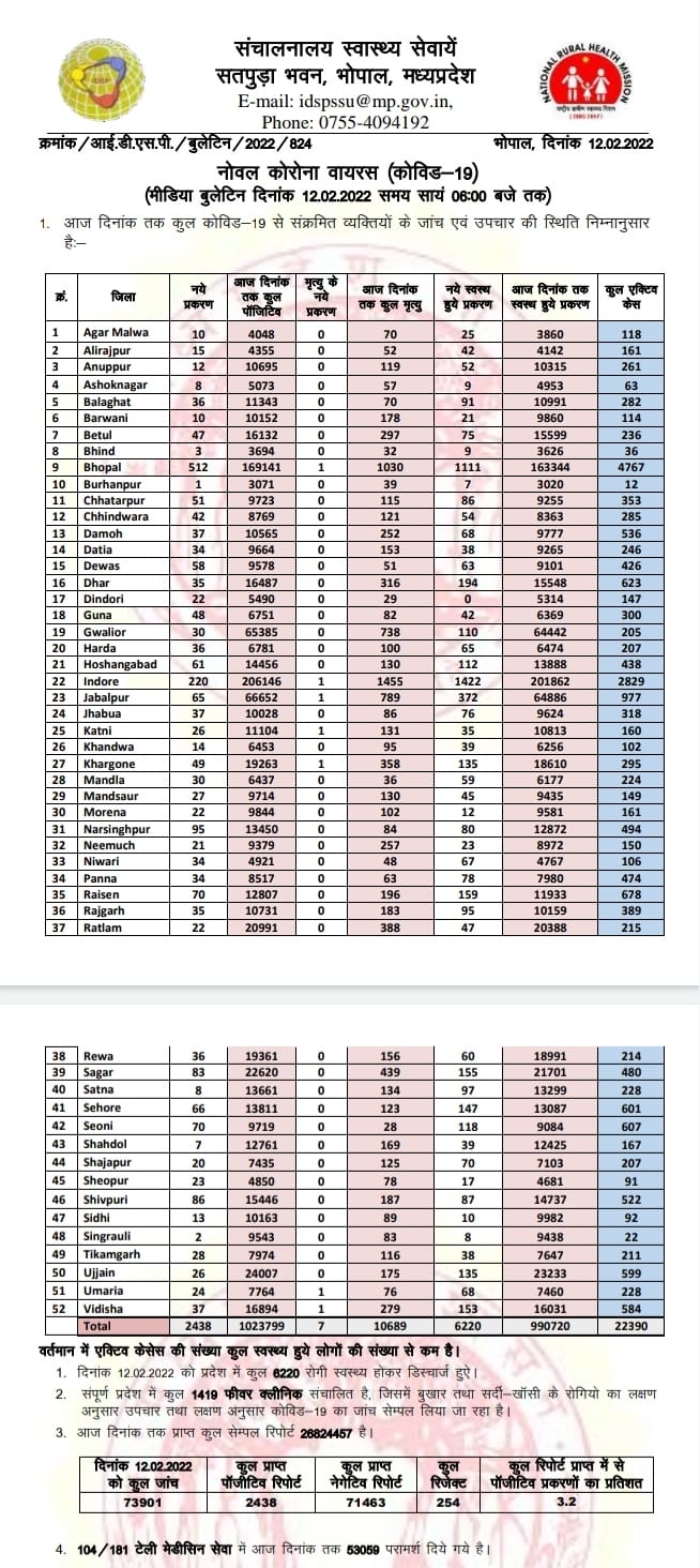 आज 12 फरवरी 2022 को आई रिपोर्ट्स के अनुसार, 2438 नए कोरोना पॉजिटिव (MP Corona Report Today) में से भोपाल में 512, इंदौर में 220, ग्वालियर में 30, जबलपुर में 65, नरसिंहपुर में 95, रायसेन-सिवनी में 70-70, सागर में 83,शिवपुरी में 86 और सीहोर में 66 बाकी अन्य जिलों में मिले है। वही बुरहानपुर, जबलपुर, कटनी, इंदौर, विदिशा, खरगोन और भोपाल में एक-एक मौत दर्ज की गई है। इसके बाद प्रदेश में एक्टिव मरीजों की संख्या 22390 हो गई है।वही 6220 मरीज डिस्चार्ज हुए है।इसके अलावा पूर्व मुख्यमंत्री दिग्विजय सिंह के भाई और गुना के चाचौड़ा से कांग्रेस विधायक लक्ष्मण सिंह (Congress MLA Laxman Singh) की भी रिपोर्ट पॉजिटिव आई है।