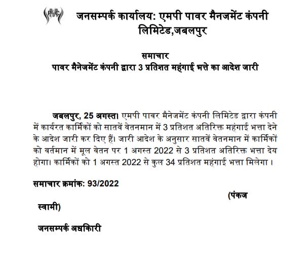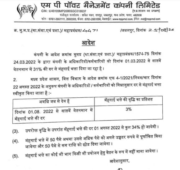 जारी आदेशानुसार, एमपी पावर मैनेजमेंट कंपनी लिमिटेड (MP Power Management Company Limited) द्वारा कंपनी में कार्यरत कर्मचारियों-अधिकारियों को सातवें वेतनमान में 3 प्रतिशत अतिरिक्त महंगाई भत्ता देने के आदेश जारी कर दिए हैं। जारी आदेश के अनुसार सातवें वेतनमान में कार्मिकों को वर्तमान में मूल वेतन पर 1 अगस्त 2022 से 3 प्रतिशत अतिरिक्त भत्ता देय होगा। कार्मिकों को | अगस्त 2022 से कुल 34 प्रतिशत महंगाई भत्ता मिलेगा ।महंगाई भत्ता दर में 50 पैसे अथवा उससे अधिक पैसे को अगले उच्चतर रुपए में पूर्णांकित किया जाएगा और 50 पैसे से कम राशि को छोड़ दिया जाएगा।DA का कोई भी भाग किसी भी प्रयोजन के लिए वेतन के रूप में नहीं माना जाएगा।