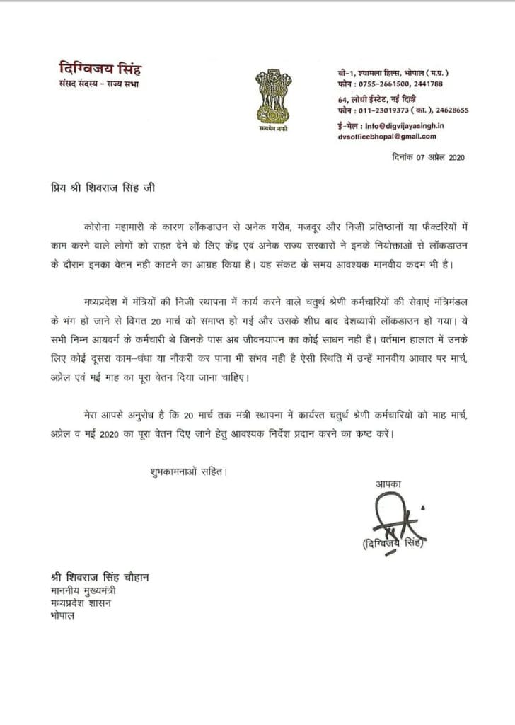 प्रदेश में 21 दिन के सख्त लॉक डाउन के बीच किसी तेरा जीवन यापन कर रहे चतुर्थ वर्गीय कर्मचारी के वेतन को लेकर पूर्व मुख्यमंत्री दिग्विजय सिंह ने मुख्यमंत्री शिवराज सिंह चौहान को पत्र लिखा है।