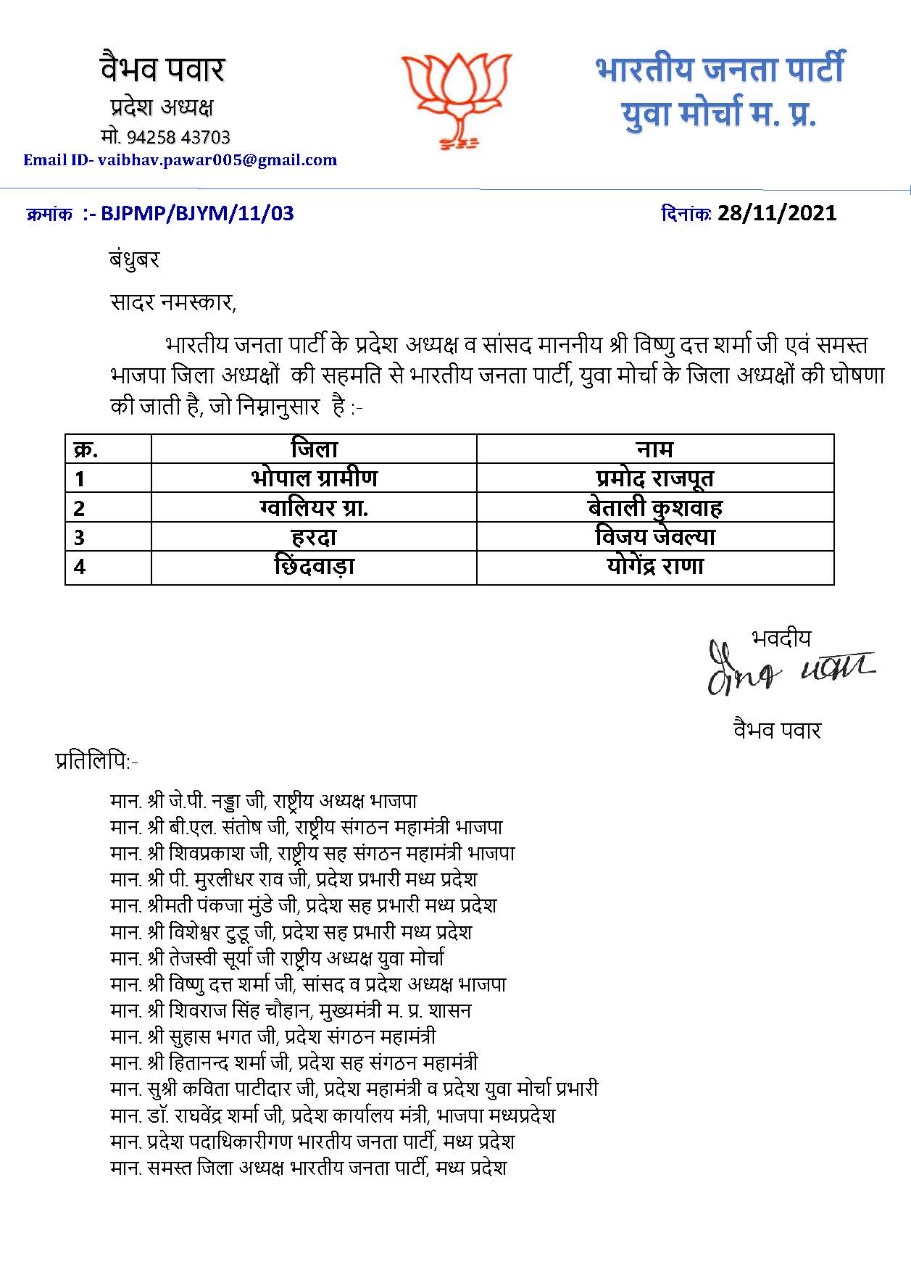 भोपाल, डेस्क रिपोर्ट। मध्य प्रदेश में आगामी चुनावों (UP Coming Election 2021) से पहले बीजेपी युवा मोर्चा की तैयारियां जोरों पर है।6 जिलों में जिलाध्यक्षों की नियुक्ति के बाद अब 4 और जिलों में जिलाध्यक्ष घोषित किए गए है। भाजपा प्रदेश अध्यक्ष वीडी शर्मा (BJP state president VD Sharma) की सहमति से युवा मोर्चा के प्रदेशाध्यक्ष वैभव पवार ने युवा मोर्चा के जिलाध्यक्षों की लिस्ट जारी की है।इसमें 4 जिलों के युवा मोर्चा के जिलाध्यक्षों का नाम ऐलान किया गया है।