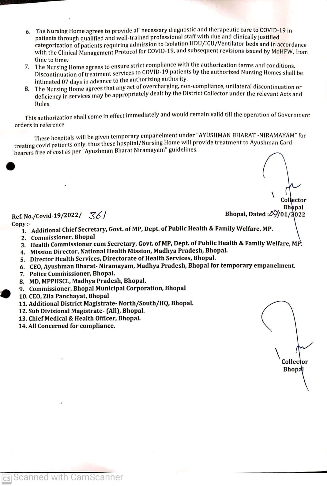 कलेक्टर श्री @AvinashLavania ने भोपाल के 5 और निजी अस्पतालों को शासन द्वारा तय सभी मापदंड की पूर्ति करने पर कोविड-19 के उपचार के लिये अधिकृत किया है।#OmicronVirus pic.twitter.com/4LF3vnBJju— Collector Bhopal (@CollectorBhopal) January 7, 2022