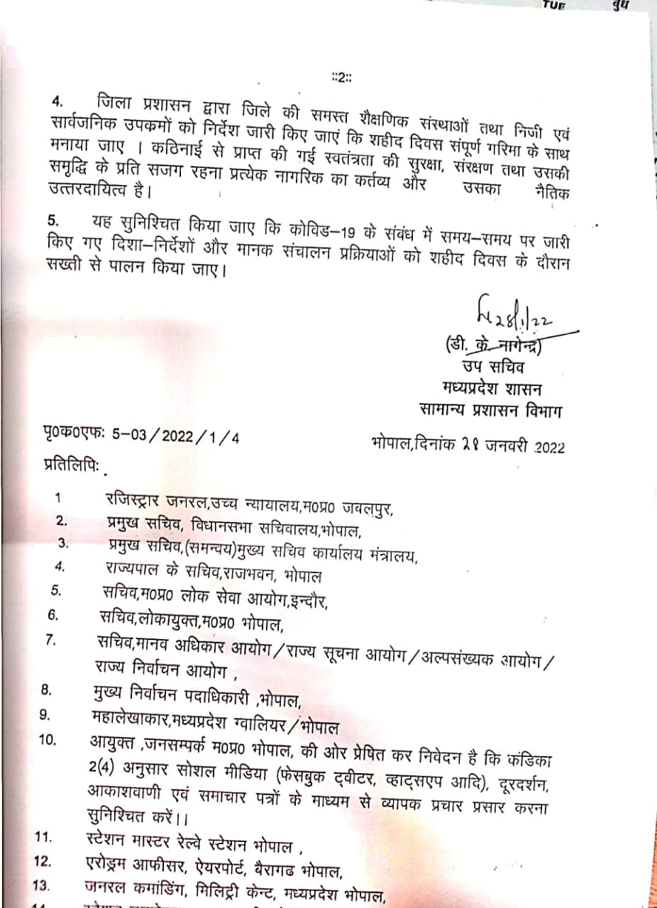भोपाल, डेस्क रिपोर्ट। मध्य प्रदेश सरकार (Madhya Pradesh Government) ने भारत के स्वतंत्रता संग्राम में बलिदान देने वाले शहीदों की स्मृति में 30 जनवरी को 2 मिनट का मौन धारण करने का फैसला किया है। इसके लिए सभी विभागाध्यक्षों, संभागीय आयुक्त और समस्त कलेक्टर को निर्देश जारी किए हैं ।इस संबंध में सामान्य प्रशासन विभाग (GAD Department) ने आदेश जारी कर दिया है।