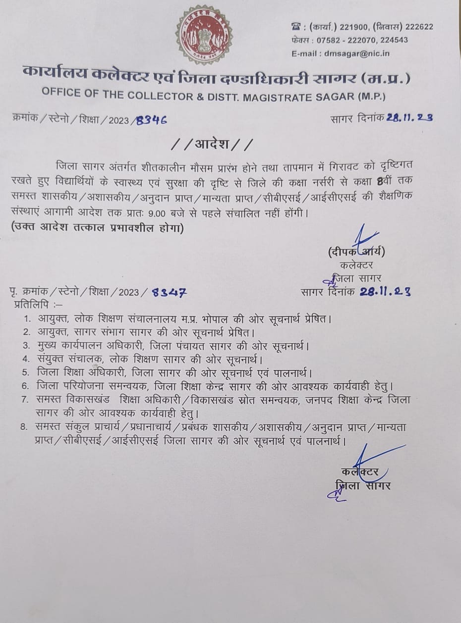 - सागर कलेक्टर द्वारा जारी आदेश के मुताबिक सागर जिलार्न्तगत तापमान में अचानक आई गिरावट के कारण समस्त शासकीय/अशासकीय अनुदान प्राप्त / मान्यता प्राप्त /सी.बी.एस.ई./आई.सी.एस.ई./ माध्यमिक शिक्षा मण्डल एवं समस्त बोर्ड से सम्बद्ध विद्यालयों में अध्ययनरत् छात्र-छात्राओं के स्वास्थय पर प्रतिकूल प्रभाव पड़ने की संभावना को दृष्टिगत रखते हुए कक्षा नर्सरी से कक्षा पांचवी तक की समस्त शालाओं का संचालन किसी भी स्थिति में प्रातः 9:00 बजे से पूर्व नही किया जावे।