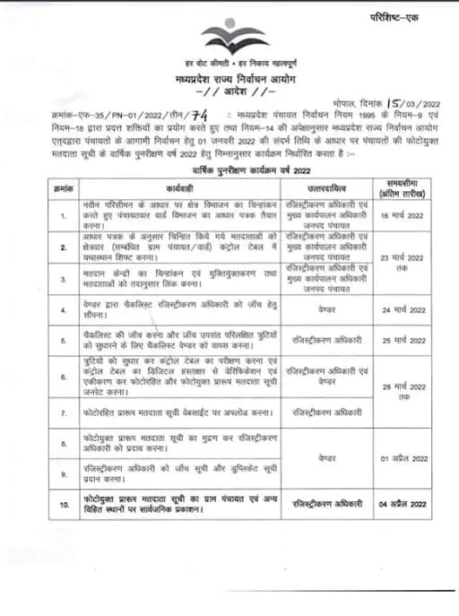 जारी निर्देश के मुताबिक 25 अप्रैल तक पंचायत के चुनाव नहीं होंगे। राज्य निर्वाचन आयोग द्वारा नए परिसीमन (new delimitation) के आधार पर वोटर लिस्ट (voter list) तैयार करने के निर्देश दिए गए हैं। जिसके लिए प्रक्रिया 16 मार्च से शुरू की जाएगी। 16 मार्च तक वोटर लिस्ट अपडेट होने का काम किया जाएगा। इसके बाद 4 अप्रैल से लेकर 16 अप्रैल तक इसके लिए दावे और आपत्तियां आमंत्रित किए गए। जबकि 25 अप्रैल को नए वोटर लिस्ट के फाइनल प्रकाशन किए जाएंगे। ऐसे में अब फाइनल वोटर लिस्ट तैयार होने के बाद ही मध्य प्रदेश में पंचायती चुनाव आयोजित हो सकेंगे।